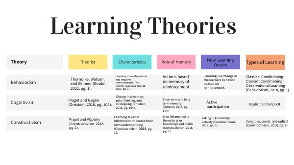 Learning takes in information to create their own understanding (Constructivism, 2018, pg. 1).