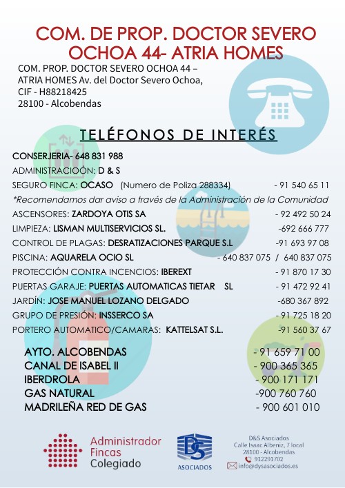 CONSERJERIA- 648 831 988 ADMINISTRACIOÓN: D & S SEGURO FINCA: OCASO (Numero de Poliza 288334) - 91 540 65 11 *Recomendamos dar aviso a través de la Administración de la Comunidad ASCENSORES: ZARDOYA OTIS SA - 92 492 50 24 LIMPIEZA: LISMAN MULTISERVICIOS SL. -692 666 777 CONTROL DE PLAGAS: DESRATIZACIONES PARQUE S.L -91 693 97 08 PISCINA: AQUARELA OCIO SL -640 837 075 PROTECCIÓN CONTRA INCENCIOS: IBEREXT - 91 870 17 30 PUERTAS GARAJE: PUERTAS AUTOMATICAS TIETAR SL - 91 472 92 41 JARDÍN: JOSE MANUEL LOZANO DELGADO -680 367 892 GRUPO DE PRESIÓN: INSSERCO SA - 91 725 18 20 PORTERO AUTOMATICO/CAMARAS: KATTELSAT S.L. -91 560 37 67
