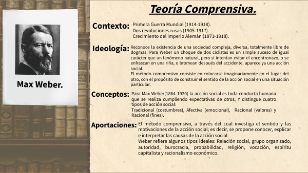El método comprensivo, a través del cual investiga el sentido y las motivaciones de la acción social; es decir, se propone conocer, explicar e interpretar las causas de la acción social. Weber refiere algunos tipos ideales: Relación social, grupo organizado, autoridad, burocracia, probabilidad, religión, vocación, espíritu capitalista y racionalismo económico.