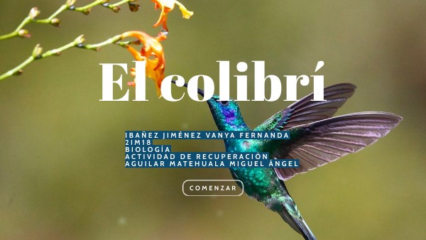 En esta presentación se hablará acerca de los colibríes, su hábitat y los factores importantes, características biológicas. A pesar de que sólo ciertas especies están consideradas en peligro de extinción, se hablará sobre las causas y las consecuencias que trairía su extinción. Veremos ciertos puntos para la prevención de la extinción de especies. Observaremos ciertas imágenes, y al final tenemos dos videos que se me hicieron realmente interesantes.
