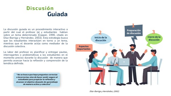 La discusión guiada es un procedimiento interactivo a partir del cual el profesor (a) y estudiantes hablan sobre un tema determinado (Copper, 1990, citado en Díaz–Barriga y Hernández, 2002). Esta estrategia busca que los estudiantes interactúen en torno a un tema, mientras que el docente actúa como mediador de la discusión colectiva. La labor del profesor es planificar y entregar pautas, interrogantes o problemáticas a los estudiantes en el momento preciso durante la discusión de manera que permita avanzar hacia la reflexión y comprensión de la temática definida.