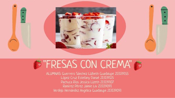 1. Comprar los ingredientes en su lugar de preferencia (20 minutos): Como ya se menciona, se refiere a la compra de todos los ingredientes de los que se harán uso para la preparación de las fresas con crema (fresas, crema, azúcar, lechera y duraznos en almíbar), depende del gusto de cada persona.2. Preparar los utensilios a utilizar (15 minutos): Se refiere a verificar los utensilios de los que se hará uso, por ejemplo: cuchillo, abrelatas, bowl, etc. 3.Lavar las fresas (5 minutos): Las fresas se lavan muy bien, quitando superficialmente la suciedad que contengan. 4. Desinfectar fresas (5 minutos): Las fresas se desinfectan posteriormente de haberlas lavado. 5. Cortar coronilla de la fresa (3 minutos): Se toma un cuchillo y se corta la hojita de las fresas 6. Cortar las fresas (5 minutos): Se toma un cuchillo y se cortan las fresas en 4 partes 7. Colocar las fresas en un bowl previamente alistado (1 minuto): Se toman las fresas ya previamente cortadas en 4 partes y se echan a un bowl ya anteriormente preparado (paso 2). 8. Abrir la crema (1 minutos): Se toma un utensilio si es necesario y se abre cuidadosamente la crema 9. Abrir la lechera (1 minutos): Se toma un utensilio si es necesario y se abre cuidadosamente la lechera. 10. Verter la crema al bowl (1 minutos): Se vacía la crema al bowl el cual ya contiene las fresas. 11. Verter la lechera al bowl (1 minutos): Se vacía la lechera a donde ya se contiene las fresas y la crema. 12. Agregar azúcar al gusto (1 minuto): Esta acción depende del gusto de cada persona 13. Tomar un utensilio (del paso 2), (1 minuto): Se toma un utensilio ya alistado, preferiblemente una pala de cocina 14. Con el utensilio tomado mezclar los ingredientes vertidos en el bowl (2 minutos): Se mezclan las fresas, la crema, la lechera, el jarabe de almíbar y el azúcar. 15. Servir las fresas con crema en otro recipiente para degustar (6 minutos): Se toma otro recipiente ya preparado (paso 2) y se sirve la cantidad que guste, acompañado de una cuchara para así poderlas llevar a su boca.