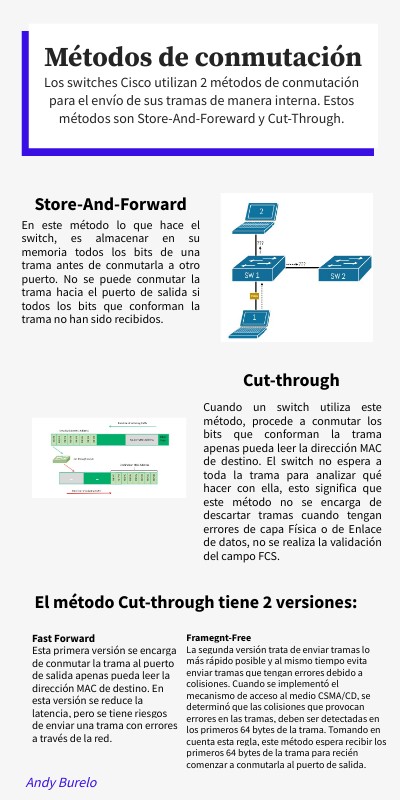 Los switches Cisco utilizan 2 métodos de conmutación para el envío de sus tramas de manera interna. Estos métodos son Store-And-Foreward y Cut-Through.
