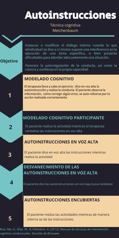 Instaurar o modificar el diálogo interno cuando lo que elindividuel se dice a sí mismo supone una interferencia en la ejecución de una tarea específica, o bien presenta dificultades para abordar adecuadamente una situación. Favorece la autorregulación de la conducta, así como la crencia y confianza en la propia capacidad.