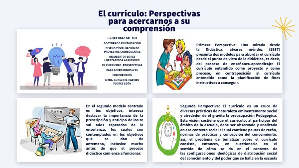 UNIVERSIDAD DEL SUR DOCTORADO EN EDUCACIÓN Diseño y evaluación de proyectos curriculares RIGOBERTO FLORES LOPEZASESOR ACADÉMICO El curriculo: Perspectivas para acercarnos a su comprensión MTRA. LUCIA DEL CARMEN FLORES LEÓN
