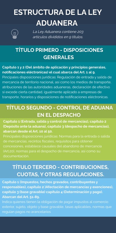 La Ley Aduanera contiene 203 artículos divididos en 9 títulos.