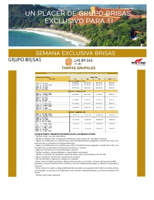 CONDICIONES Y BENEFICIOS ESPECIALES LAS BRISAS IXTAPA: • Tarifas netas, no comisionables. • Tarifas en Brisas Plan Grupal por habitación por noche en categoría Deluxe • Aplica 01 habitación en cortesía por cada 18 habitaciones pagadas a partir de la 19, con máximo de 4 cortesías en temporada baja. • Aplica 01 habitación en cortesía por cada 25 habitaciones pagadas a partir de la 26, con máximo de 4 cortesías en semana de pascua y verano. • Aplican menores al 2x1 de domingo a jueves. • Tarifas sujetas a disponibilidad y capacidad controlada • Tarifas no aplican en puentes, semana santa, pascua, Navidad y fin de año. • Aplica estancia mínima de 3 noches en verano • No se permiten ingresos y salidas en sábado • Early check in $590 adultos y $290 menores de 3 a 12 años, incluye: desayuno buffet, bebidas y snack a partir de las 11:00hrs, uso de instalaciones playa y alberca, impuestos y servicio. • Early check in sujeto a disponibilidad de acuerdo a ocupación del hotel la noche previa a la llegada, el acceso a la habitación esta sujeta a disponibilidad y no esta incluido en el costo. • Tarifas 2023 bajo solicitud.