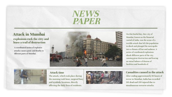 On this fateful day, thev city of Mumbai, known as the financial caoital of India, was the scene of a terrible attack that left the population in shock and plunged the metropolis into a climate of fear and sadness. A series of coordinated explosiosn shook different parts of the city, causing great destruction and leaving an initial balance of dozens of fatalities and hundreds of.