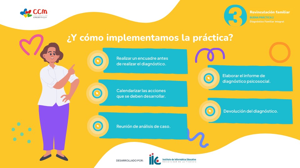 Antes de comenzar a recoger los insumos para construir el diagnóstico, es importante que se realice un encuadre con la familia o adulto/a significativo/a donde se señala el proceso de intervención, las etapas y las condiciones de cómo se va realizar el diagnóstico y luego su devolución, donde se construirá en conjunto el plan de intervención.