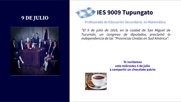 "El 9 de julio de 1816, en la ciudad de San Miguel de Tucumán, un congreso de diputados, proclamó la independencia de las “Provincias Unidas en Sud América”.