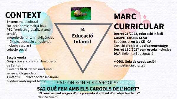 Entorn: multicultural socioeconomic maitja-baix PEC "projecte globalitzat amb sentit", metòde cientifíc, Intel·ligències múltiple, educació emocional, inclusió escolar i cohesió social Escola verda Grup classe: cohesió i descoberta de l'entorn. 3 infants NESE retard maduratiu sense etiologia clara 1 infant NEE discapacitat sensiorial auditiva amb suport tècnic