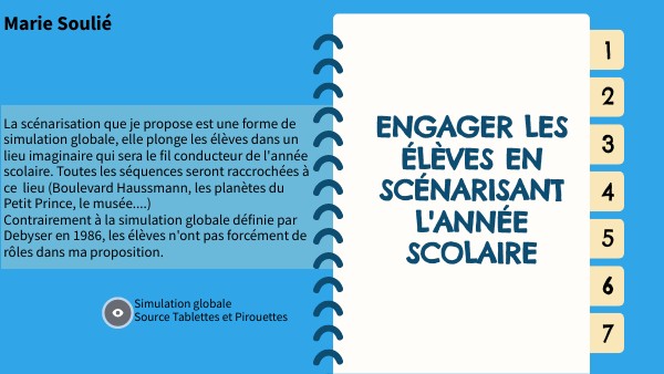 La scénarisation que je propose est une forme de simulation globale, elle plonge les élèves dans un lieu imaginaire qui sera le fil conducteur de l'année scolaire. Toutes les séquences seront raccrochées à ce lieu (Boulevard Haussmann, les planètes du Petit Prince, le musée....) Contrairement à la simulation globale définie par Debyser en 1986, les élèves n'ont pas forcément de rôles dans ma proposition.
