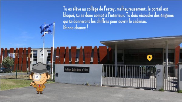 Tu es élève au collège de l'estey, malheureusement, le portail est bloqué, tu es donc coincé à l'interieur. Tu dois résoudre des énigmes qui te donneront les chiffres pour ouvrir le cadenas. Bonne chance !