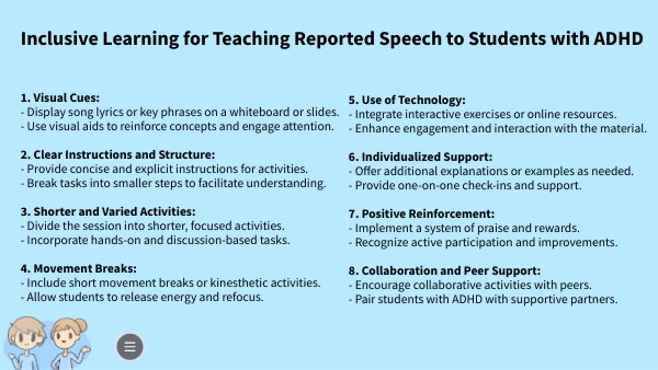 1. Visual Supports: -Pictorial representations or symbols for reported speech rules. -Visual schedules or checklists for task sequences. 2. Predictability and Structure: - Establishing a predictable routine with clear expectations.. - Visual or written cues for activity transitions. 3. Personalized Learning Materials: - Individualized materials with simplified language and preferred visuals - Alternative formats like digital or interactive resources. 4. Incorporate Special Interests: - Choose a song aligned with the student's interests.. - Relate exercises to the student's preferred topics.