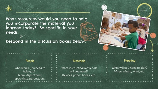 What resources would you need to help you incorporate the material you learned today? Be specific in your needs. Respond in the discussion boxes below.