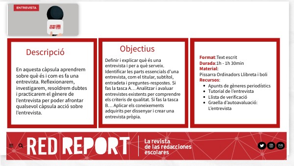 En aquesta càpsula aprendrem sobre què és i com es fa una entrevista. Reflexionarem, investigarem, resoldrem dubtes i practicarem el gènere de l’entrevista per poder afrontar qualsevol càpsula acció sobre l’entrevista.