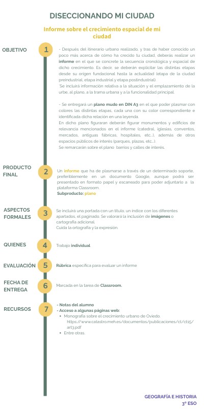 - Después del itinerario urbano realizado, y tras de haber conocido un poco más acerca de cómo ha crecido vuestra ciudad, deberéis realizar un informe en el que se concrete la secuencia cronológica y espacial de dicho crecimiento. Es decir, explicitar las distintas fases desde su origen fundacional hasta la actualidad.`Se incluirá información relativa a la situación y emplazamiento de la urbe, al plano, a la trama urbana y a la funcionalidad principal.- Se entregará un plano mudo en DIN A3 en el que poder plasmar con colores la estructura o zonificación urbana, es decir, cómo se organiza la ciudad en distintas zonas o partes, cada una con su color correspondiente e identificada dicha relación en una leyenda.En dicho plano deberán figurar monumentos y edificios de relevancia mencionados en el informe (iglesias, mercados, cuarteles, antiguos hospitales, hornos de cal, etc...), además de otros espacios públicos de interés (parques, plazas, etc...).Se remarcarán sobre el plano el nombre de barrios y calles de interés.