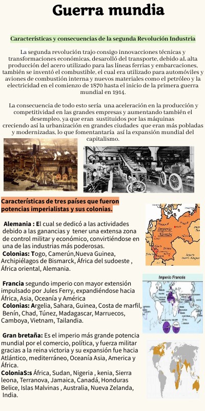 Características de tres países que fueron potencias imperialistas y sus colonias. Alemania : El cual se dedicó a las actividades debido a las ganancias y tener una extensa zona de control militar y económico, convirtiéndose en una de las industrias más poderosas. Colonias: Togo, Camerún,Nueva Guinea, Archipiélagos de Bismarck, África del sudoeste , África oriental, Alemania. Francia segundo imperio con mayor extensión impulsado por Jules Ferry, expandiéndose hacia África, Asia, Oceanía y América Colonias: Argelia, Sahara, Guinea, Costa de marfil, Benín, Chad, Túnez, Madagascar, Marruecos, Camboya, Vietnam, Tailandia. Gran bretaña: Es el imperio más grande potencia mundial por el comercio, política, y fuerza militar gracias a la reina victoria y su expansión fue hacia Atlántico, mediterráneo, Oceanía Asia, America y África. ColoniaS:s África, Sudan, Nigeria , kenia, Sierra leona, Terranova, Jamaica, Canadá, Honduras Belice, Islas Malvinas , Australia, Nueva Zelanda, India.