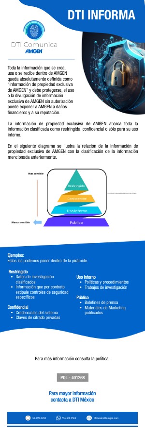 Toda la información que se crea,usa o se recibe dentro de AMGEN queda absolutamente definida como “información de propiedad exclusivade AMGEN” y debe protegerse, el uso o la divulgación de información exclusiva de AMGEN sin autorización puede exponer a AMGEN a daños financieros y a su reputación.