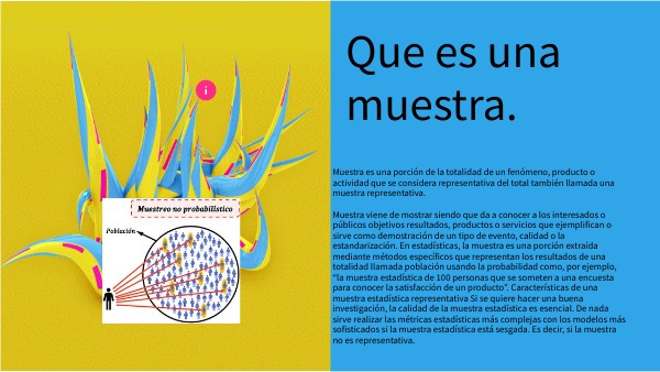 Muestra viene de mostrar siendo que da a conocer a los interesados o públicos objetivos resultados, productos o servicios que ejemplifican o sirve como demostración de un tipo de evento, calidad o la estandarización. En estadísticas, la muestra es una porción extraída mediante métodos específicos que representan los resultados de una totalidad llamada población usando la probabilidad como, por ejemplo, “la muestra estadística de 100 personas que se someten a una encuesta para conocer la satisfacción de un producto”. Características de una muestra estadística representativa Si se quiere hacer una buena investigación, la calidad de la muestra estadística es esencial. De nada sirve realizar las métricas estadísticas más complejas con los modelos más sofisticados si la muestra estadística está sesgada. Es decir, si la muestra no es representativa.