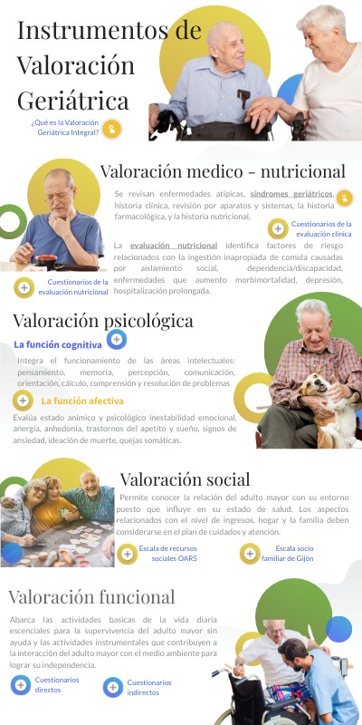 Se revisan enfermedades atípicas, síndromes geriátricos, historia clínica, revisión por aparatos y sistemas, la historia farmacológica, y la historia nutricional.