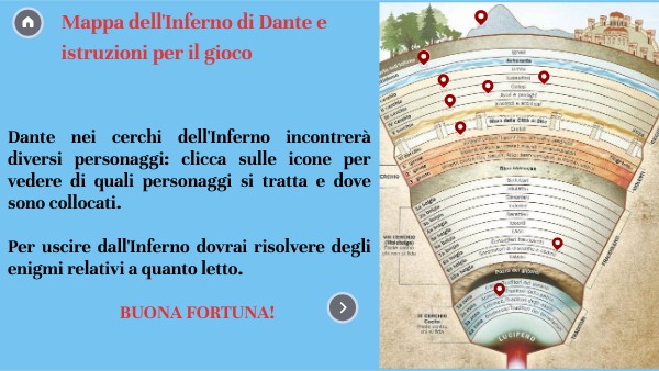 Dante nei cerchi dell'Inferno incontrerà diversi personaggi: clicca sulle icone per vedere di quali personaggi si tratta e dove sono collocati. Per uscire dall'Inferno dovrai risolvere degli enigmi relativi a quanto letto. BUONA FORTUNA!