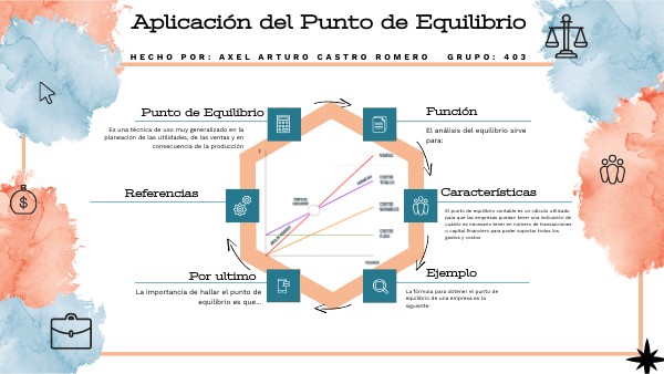 1. Determinar el nivel de operaciones necesario para cubrir todos los costos relativos a estas 2. Evaluar la rentabilidad de los diversos niveles de producción y ventas 3. Planear la producción 4. Planear las ventas 5. Planear resultados antes y después de ISR y PTU 6. Controlar costos 7. Tomar decisiones En el análisis de equilibrio intervienen costos y gastos