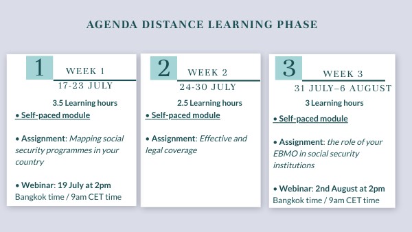 • Self-paced module • Assignment: the role of your EBMO in social security institutions • Webinar: 2nd August at 2pm Bangkok time / 9am CET time