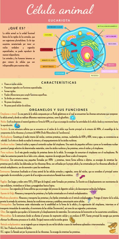 La célula animal es la unidad funcional básica de los tejidos de los animales, que son organismos pluricelulares. Es de tipo eucariota caracterizada por tener un núcleo verdadero y organelos especializados, se puede reproducir de manera independiente. Los animales y los humanos tenemos un gran número de células que son indispensables para nuestras vidas.