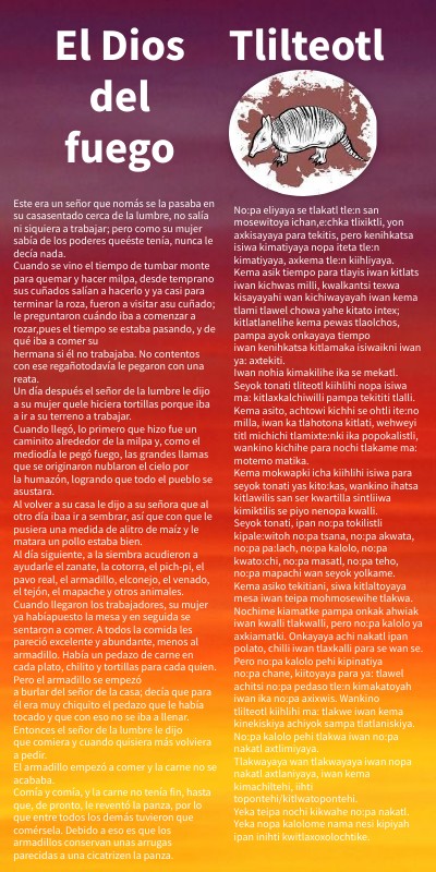 Este era un señor que nomás se la pasaba en su casasentado cerca de la lumbre, no salía ni siquiera a trabajar; pero como su mujer sabía de los poderes queéste tenía, nunca le decía nada. Cuando se vino el tiempo de tumbar monte para quemar y hacer milpa, desde temprano sus cuñados salían a hacerlo y ya casi para terminar la roza, fueron a visitar asu cuñado; le preguntaron cuándo iba a comenzar a rozar,pues el tiempo se estaba pasando, y de qué iba a comer su hermana si él no trabajaba. No contentos con ese regañotodavía le pegaron con una reata. Un día después el señor de la lumbre le dijo a su mujer quele hiciera tortillas porque iba a ir a su terreno a trabajar. Cuando llegó, lo primero que hizo fue un caminito alrededor de la milpa y, como el mediodía le pegó fuego, las grandes llamas que se originaron nublaron el cielo por la humazón, logrando que todo el pueblo se asustara. Al volver a su casa le dijo a su señora que al otro día ibaa ir a sembrar, así que con que le pusiera una medida de alitro de maíz y le matara un pollo estaba bien. Al día siguiente, a la siembra acudieron a ayudarle el zanate, la cotorra, el pich-pi, el pavo real, el armadillo, elconejo, el venado, el tejón, el mapache y otros animales. Cuando llegaron los trabajadores, su mujer ya habíapuesto la mesa y en seguida se sentaron a comer. A todos la comida les pareció excelente y abundante, menos al armadillo. Había un pedazo de carne en cada plato, chilito y tortillas para cada quien. Pero el armadillo se empezó a burlar del señor de la casa; decía que para él era muy chiquito el pedazo que le había tocado y que con eso no se iba a llenar. Entonces el señor de la lumbre le dijo que comiera y cuando quisiera más volviera a pedir. El armadillo empezó a comer y la carne no se acababa. Comía y comía, y la carne no tenía fin, hasta que, de pronto, le reventó la panza, por lo que entre todos los demás tuvieron que comérsela. Debido a eso es que los armadillos conservan unas arrugas parecidas a una cicatrizen la panza.