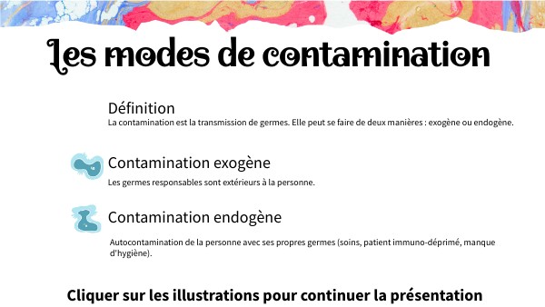 La contamination est la transmission de germes. Elle peut se faire de deux manières : exogène ou endogène.