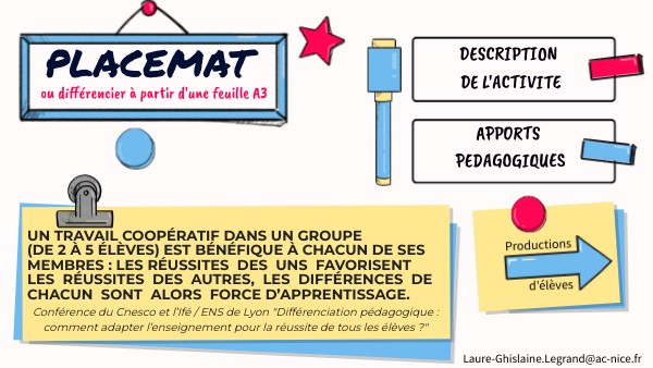 APPORTS PÉDAGOGIQUES — La combinaison du travail individuel silencieux et du travail en groupe par la suite permet de façon assez simple d’intégrer tous les élèves dans le cours. Par expérience, aucun élève ne souhaiterait se retrouver à la fin avec une case non remplie. Un regard sur les placemats achevés suffit pour constater que tous ont débattu de façon intensive sur la question posée. — Bien que les participants du groupe ne parlent pas dans la première phase, ils communiquent entre eux d’une façon non verbale. Ils regardent les contributions des autres et relient leur contribution à celles des autres. — Les placemats créent une ambiance paisible dans la salle de classe.