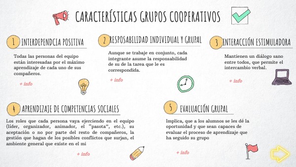 Los roles que cada persona vaya ejerciendo en el equipo (líder, organizador, animador, el “pasota”, etc.), su aceptación o no por parte del resto de compañeros, la gestión que hagan de los posibles conflictos que surjan, el ambiente general que existe en el mi