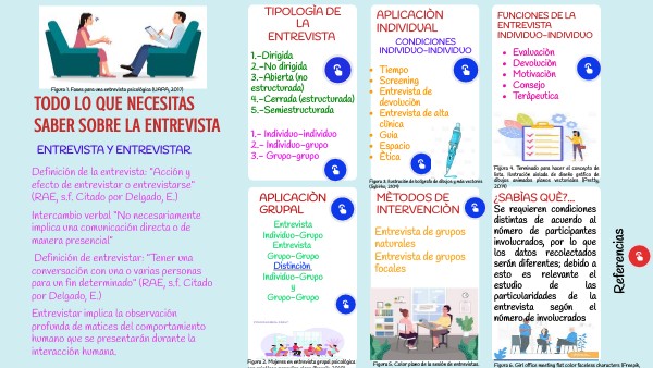 Delgado, E. (2023) Lección 1. Definiciones de entrevista y entrevistar. En Teoría y técnica de la entrevista v1. Universidad virtual del estado de Guanajuato. https://view.genial.ly/61952cd3d44c380d6ee10395/interactive-content-ttel1 Delgado, E. (2023) Lección 3. Nociones básicas para la aplicación individual. En Teoría y técnica de la entrevista v1. Universidad virtual del estado de Guanajuato. https://view.genial.ly/618ee07beb40800d8f4aa9a1/interactive-content-ttel3 Delgado, E. (2023) Lección 4. Nociones básicas para la aplicación grupal. En Teoría y técnica de la entrevista v1. Universidad virtual del estado de Guanajuato. https://view.genial.ly/618ee0e9e6be9e0d3ece3b95/interactive-content-ttel4 UVEG Académico (2021) La entrevista y su tipología (Video) YouTube. https://www.youtube.com/watch?v=vz2CZzLoSTI Figura 1. Fases para una entrevista psicológica (UAPA, 2017) Figura 2. Mujeres en entrevista grupal psicológica con psicólogo masculino plano (Freepik, 2010) Figura 3. Ilustración de bolígrafo de dibujos y más vectores (Sybirko, 2109) Figura 4. Terminado para hacer el concepto de lista. Ilustración aislada de diseño gráfico de dibujos animados planos vectoriales (Pretty, 2019) Figura 5. Color plano de la sesión de entrevistas. charla admonitoria (Freepik, 2023) Figura 6. Girl office meeting flat color faceless characters (Freepik, 2022)