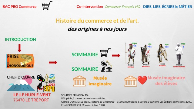 Ce travail a été mené en 2022-2023 dans le cadre de la co-intervention Commerce-Français-HG au Lycée LE HURLE-VENT du TRÉPORT en Seine-Maritime. Il avait vocation à entrer dans la dimension DLE (Dire, Lire, Écrire) le Métier des programmes de l'EN.