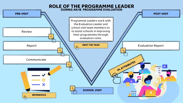 The Programme Leader is responsible for the preliminary report, collaborating with the EL to attend meetings and sessions in the school visit. The PL is knowledgeable in at least one programme of the IB.