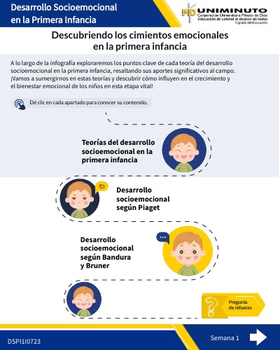 En la primera infancia el desarrollo socioemocional es una parte fundamental del crecimiento y bienestar de los niños y diversos teóricos han explorado este tema, brindando perspectivas valiosas que nos ayudan a comprender cómo los niños adquieren habilidades sociales y emocionales durante esta etapa crucial de sus vidas (Gómez, 2017). En esta infografía la base central son las teorías del desarrollo socioemocional según Vigotsky, Piaget, Bandura y Bruner. A través de sus enfoques únicos, estos teóricos nos brindan una comprensión más profunda de cómo los niños interactúan con su entorno y adquieren competencias emocionales y sociales (Raynaudo, 2017).