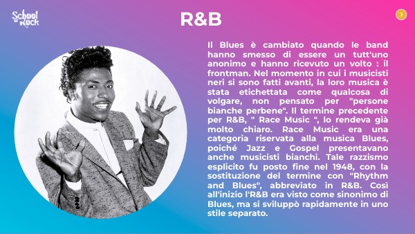 Il Blues è cambiato quando le band hanno smesso di essere un tutt'uno anonimo e hanno ricevuto un volto : il frontman. Nel momento in cui i musicisti neri si sono fatti avanti, la loro musica è stata etichettata come qualcosa di volgare, non pensato per "persone bianche perbene". Il termine precedente per R&B, " Race Music ", lo rendeva già molto chiaro. Race Music era una categoria riservata alla musica Blues, poiché Jazz e Gospel presentavano anche musicisti bianchi. Tale razzismo esplicito fu posto fine nel 1948, con la sostituzione del termine con "Rhythm and Blues", abbreviato in R&B. Così all'inizio l'R&B era visto come sinonimo di Blues, ma si sviluppò rapidamente in uno stile separato.