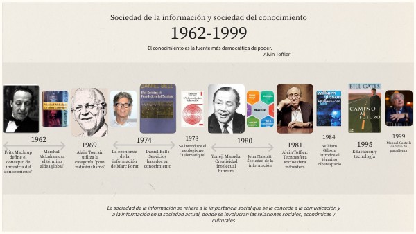 En esta línea del tiempo se rescatan rasgos distintivos de diferentes autores desde 1960 hasta 1999 sobre el tema social del conocimiento y de la información