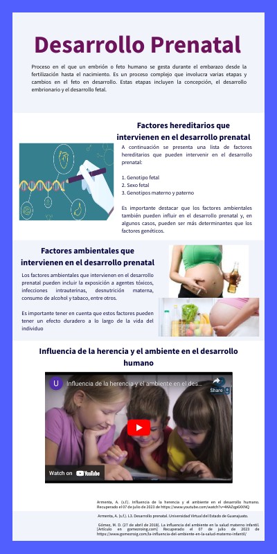Armenta, A. (s.f.). Influencia de la herencia y el ambiente en el desarrollo humano. Recuperado el 07 de julio de 2023 de https://www.youtube.com/watch?v=4KAZqp6XXNQ Armenta, A. (s.f.). L3. Desarrollo prenatal. Universidad Virtual del Estado de Guanajuato. Gómez, M. D. (27 de abril de 2018). La influencia del ambiente en la salud materno infantil. [Artículo en gomezroing.com] Recuperado el 07 de julio de 2023 de https://www.gomezroig.com/la-influencia-del-ambiente-en-la-salud-materno-infantil/