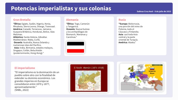 "El imperialismo es la dominación de un pueblo sobre otro con la finalidad de extender su dominio económico. Los grandes imperios en Europa se consolidaron entre 1870 y 1877, aproximadamente." (SNBL, 2022)