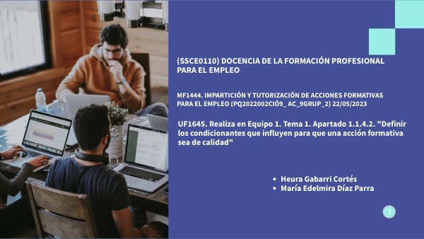 UF1645. Realiza en Equipo 1. Tema 1. Apartado 1.1.4.2. "Definir los condicionantes que influyen para que una acción formativa sea de calidad"