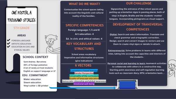 Digital: Search and select information. Translate and check grammar and ortographic correction.Design, search and convert images to vectors and use them to create vinyl signs or details to attach. Entrepreneurial: Solve problems in teams with different roles, considering the students' capacities and interests. Personal, social and learning to learn: teamwork activities to collaborate with others in a constructive way. Starting point awareness and self-regulation learning tools such as classroom diary, KPSI...