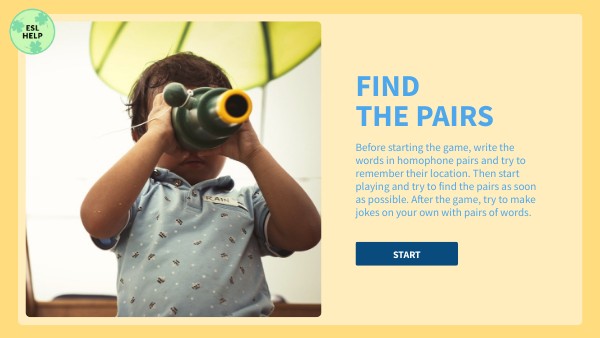 Before starting the game, write the words in homophone pairs and try to remember their location. Then start playing and try to find the pairs as soon as possible. After the game, try to make jokes on your own with pairs of words.