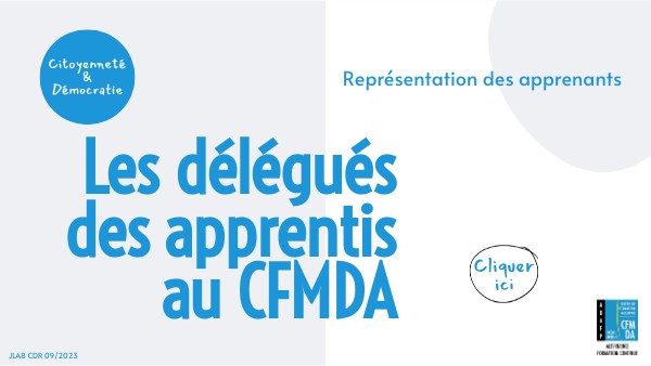 Le centre de formation existe pour former de futurs artisans. Ces apprenants sont les plus à même de faire remonter des idées ou des retours d'information aux équipes du CFMDA afin de le faire progresser dans sa démarche permanente d'amélioration. Les délégués sont les personnes choisies et élues par leurs pairs pour porter leur voix auprès des responsables du CFMDA. Présentez-vous aux élections ou élisez le candidat qui vous représentera le mieux !