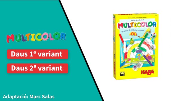 Llença els quatre daus i tria una combinació d'un dau numèric i un altre de color. Cerca una zona del teu dibuix amb aquella combinació i acoloreix-la. En aquesta variant de joc cada flor o filera de l'arc de sant Martí ha de ser d'un únic color. Important: - El color blanc et permet triar qualsevol altre color. - Si els dos daus de colors coincideixen empra el color indicat. - Si al teu dibuix no queden caselles amb els punts mostrats al dau, mala sort...no pots pintar. La partida acaba quan un jugador hagi acolorit el seu dibuix al complet. En cas d'empat, tots guanyen!