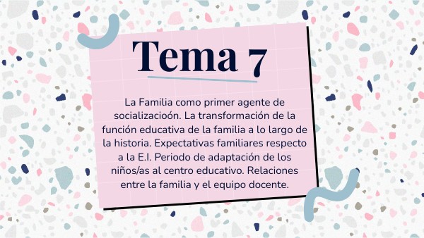 La Familia como primer agente de socializacioón. La transformación de la función educativa de la familia a lo largo de la historia. Expectativas familiares respecto a la E.I. Periodo de adaptación de los niños/as al centro educativo. Relaciones entre la familia y el equipo docente.