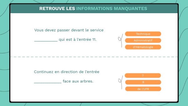 Il existe deux entrées : L'entrée 8 ou 6, mais ne passez pas par l'entrée _____________, celle-ci est réservée aux patients en situation de