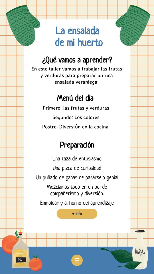 Una taza de entusiasmo Una pizca de curiosidad Un puñado de ganas de pasárselo genial Mezclamos todo en un bol de compañerismo y diversión. Enmoldar y al horno del aprendizaje