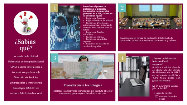 A través de la Unidad Politécnica de Integración Social (UPIS), puedes tener acceso a los servicios que brinda la Dirección de Servicios Empresariales y Transferencia Tecnológica (DSETT) del Instituto Politécnico Nacional.